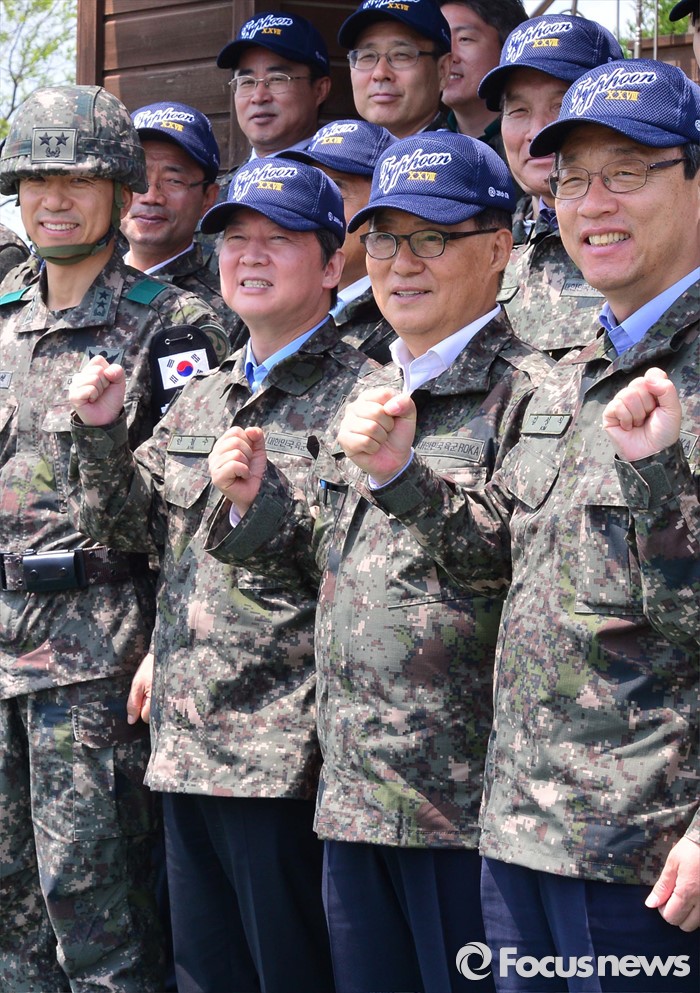 (연천=포커스뉴스) 안철수(오른쪽 세번째) 국민의당 상임공동대표, 박지원(오른쪽 두번째) 원내대표 등 의원 및 당선인들이 12일 오전 경기도 연천 전방부대를 방문해 군 관계자들과 함께 기념촬영을 하고 있다.