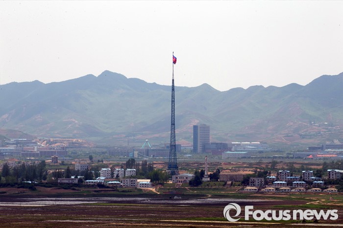 (파주=포커스뉴스) 36년 만에 열린 북한의 제7차 노동당 대회에서 김정은 국방위원회 제1위원장이 노동당 위원장으로 취임했다. 이번 당대회는 김정은의 독재를 더욱 공고히 하기 위한 우상화 노선의 연장선이라는 평가가 나오고 있다. 사진은 12일 오후 경기도 파주시 공동경비구역(JSA) 오울렛 초소에서 바라본 북한 기정동마을의 모습.