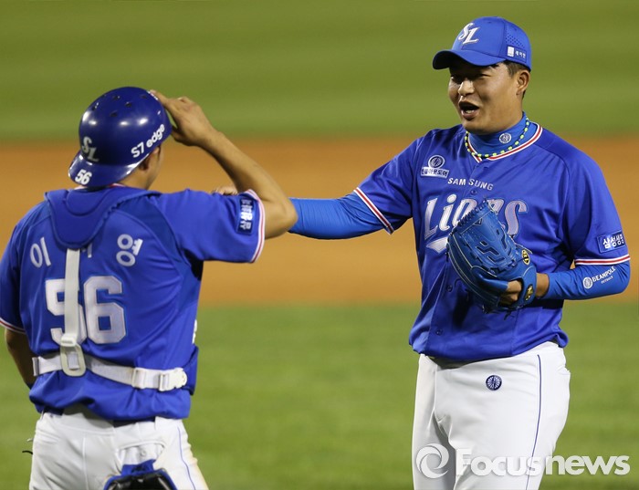 (서울=포커스뉴스) 12일 서울 잠실구장에서 열린 2016 프로야구 삼성-LG 경기에서 9회말 마운드에 올라 승리를 지킨 삼성 투수 심창민이 포수 이지영과 승리의 기쁨을 나누고 있다.