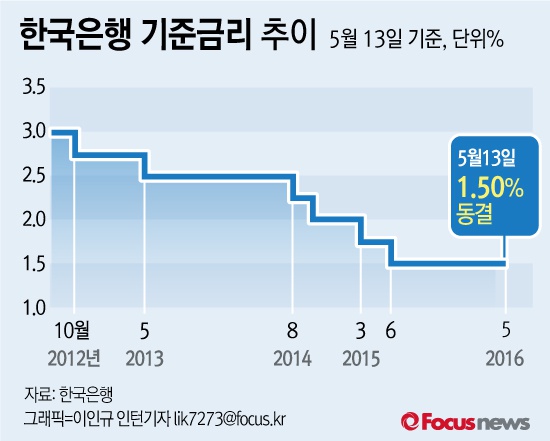 (서울=포커스뉴스) 한국은행이 13일 금융통화위원회(금통위) 정례회의를 열고 5월 기준금리를 연 1.5%로 동결했다. 기준금리는 지난해 6월 1.75%에서 0.25%포인트 내린 이후 11개월 연속 같은 수준이다.