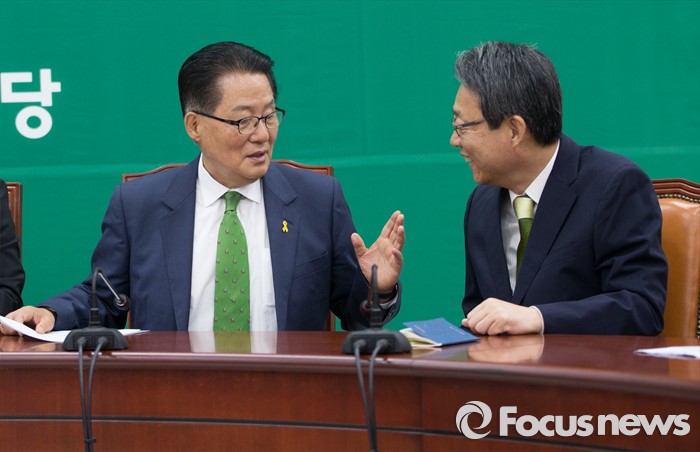 (서울=포커스뉴스) 박지원 국민의당 원내대표와 김성식 정책위의장이 13일 오전 서울 여의도 국회에서 열린 최고위원회의에 참석해 대화를 나누고 있다.