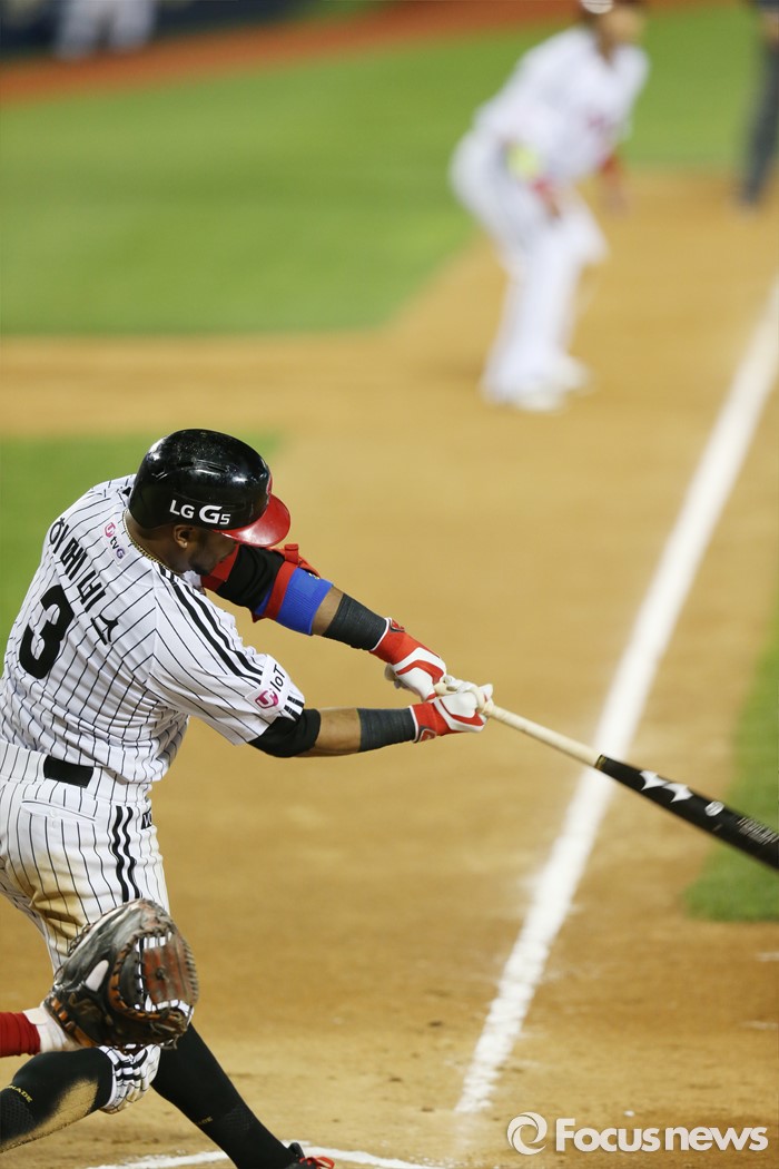 (서울=포커스뉴스) 13일 서울 잠실구장에서 열린 2016 프로야구 SK-LG 경기 6회말 무사 3루에서 LG 히메네스가 좌익선상으로 빠지는 적시 2루타를 치고 있다.