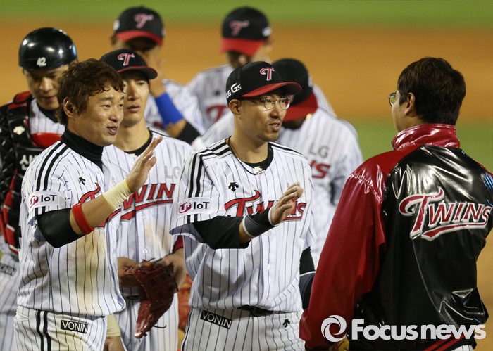 (서울=포커스뉴스) 13일 서울 잠실구장에서 열린 2016 프로야구 SK-LG 경기에서 SK를 2-1로 물리친 LG의 승리투수 류제국이 선수들과 하이파이브하고 있다.
