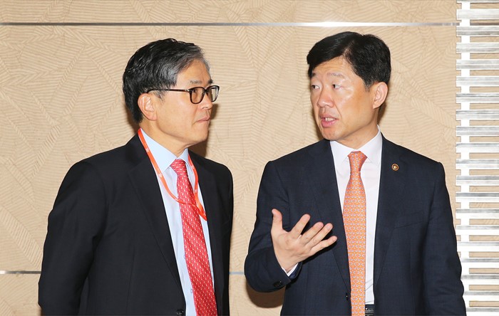 (서울=포커스뉴스) 우태희 산업통상자원부 2차관이 13일 서울 중구 소공동 롯데호텔 칼톤스위트룸에서 열린 제4차 통상정책포럼에 참석해 참석자와 대화를 나누고 있다. <사진제공=산업통상자원부>
