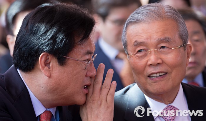 (서울=포커스뉴스) 14일 오전 서울 종로구 조계사 대웅전에서 열린 불기 2560년 부처님 오신날 봉축 법요식에서 정진석(왼쪽) 새누리당 원내대표와 김종인 더불어민주당 비대위 대표가 대화하고 있다.