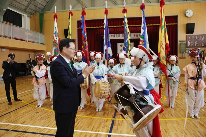 | △ 건국학교 전통예술부 단원 격려하는 정의화 의장 |