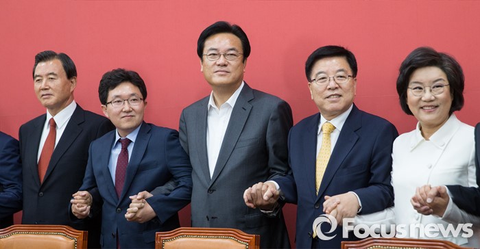 (서울=포커스뉴스) 정진석 새누리당 원내대표와 김광림 정책위의장, 김용태 혁신위원장을 비롯한 비대위원들이 16일 오전 서울 여의도 국회에서 상견례를 갖고 취재진을 향해 포즈를 취하고 있다. 왼쪽부터 홍문표 사무총장 대행, 김용태 혁신위원장, 정진석 원내대표, 김광림 정책위의장, 이혜훈 비대위원.