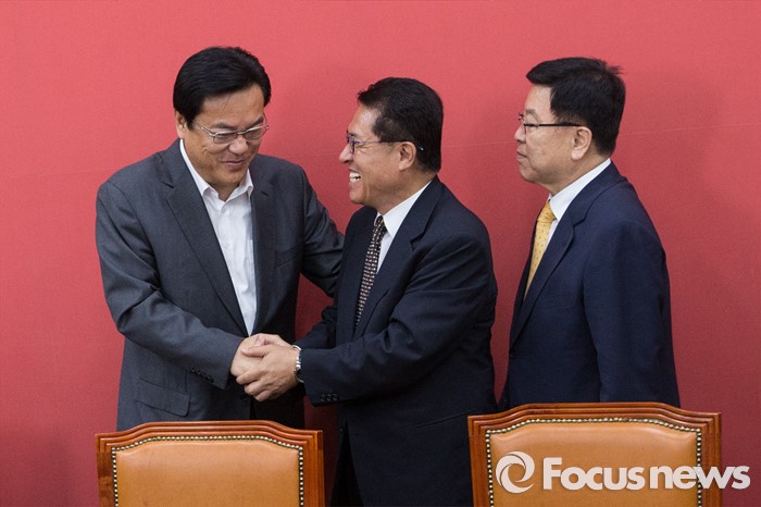 (서울=포커스뉴스) 정진석(왼쪽) 새누리당 원내대표가 16일 오전 서울 여의도 국회에서 열린 비상대책위원회 상견례에서 정운천(가운데) 비대위원과 인사를 나누고 있다. 오른쪽은 김광림 정책위의장.