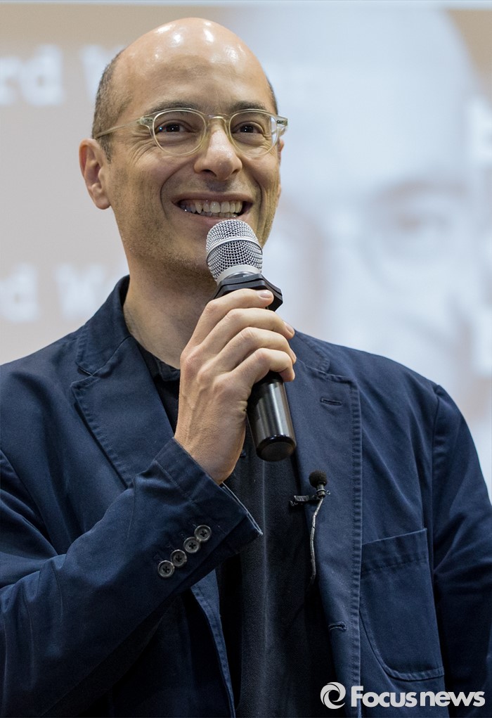 (서울=포커스뉴스) 16일 오후 서울 종로구 서울예술고등학교를 찾은 프랑스 작가 베르나르 베르베르가 '오늘날의 예술적 지능'이란 주제로 학생들에게 강연하고 있다.