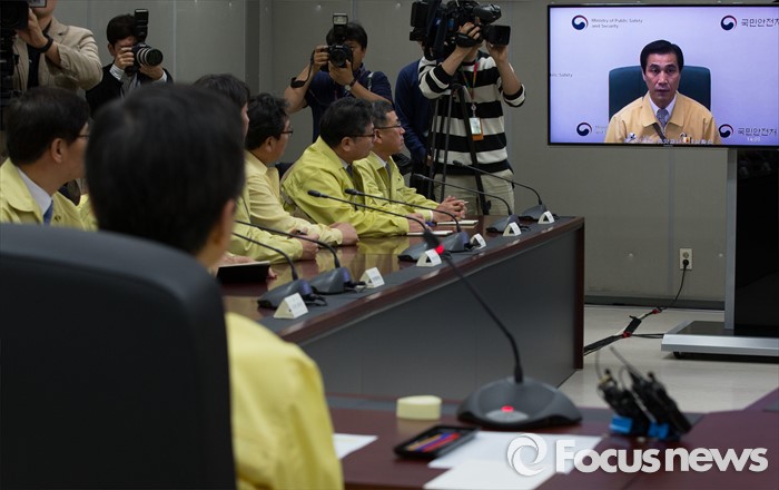 (세종=포커스뉴스) 황교안 국무총리가 16일 오후 세종시 정부세종청사 위기관리종합상황실에서 민방위의 날을 맞아 실시된 제401차 민방공 대피훈련에 참가해 국민안전처와 영상회의를 하고 있다.