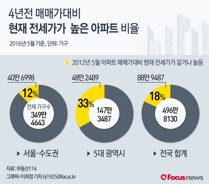 (서울=포커스뉴스) 16일 부동산114가 서울‧수도권과 5대광역시(부산‧대구‧광주‧대전‧울산)에 있는 아파트 496만8130가구를 대상으로 2016년 5월 현재 전세가격과 4년 전인 2012년 5월의 매매가격을 비교한 결과 18%인 88만9487가구는 현 전세금이 4년 전의 아파트값과 같거나 더 높아진 것으로 나타났다.