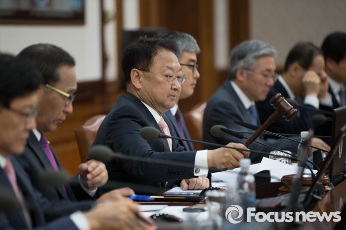 (서울=포커스뉴스) 17일 서울 종로구 정부서울청사에서 열린 국무회의에 참석한 유일호(왼쪽 세번째) 경제부총리 겸 기획재정부 장관이 회의 시작을 알리는 의사봉을 두드리고 있다.