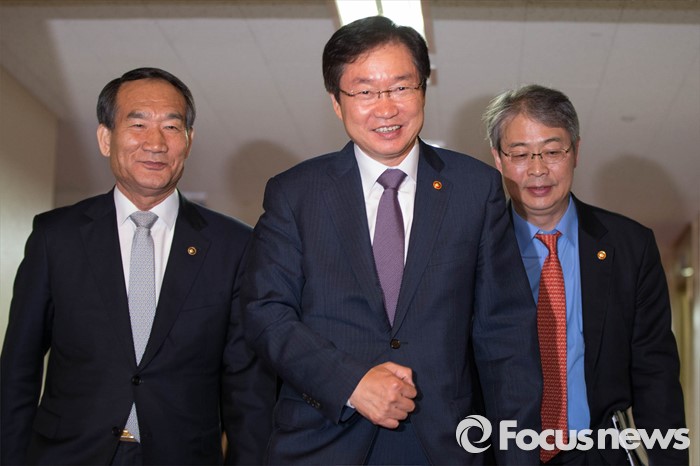 (서울=포커스뉴스) 17일 서울 종로구 정부서울청사에서 열린 국무회의에 국무위원들이 참석하고 있다. 왼쪽부터 박승춘 국가보훈처장, 김영석 해양수산부 장관, 임종룡 금융위원장.