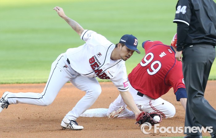 (서울=포커스뉴스) 17일 서울 잠실구장에서 열린 2016프로야구 KIA-두산 경기 1회초 2사후좌중간 안타로 진루한 KIA 필이 나지완 타석때 2루 도루를 시도해 세이프되고 있다.