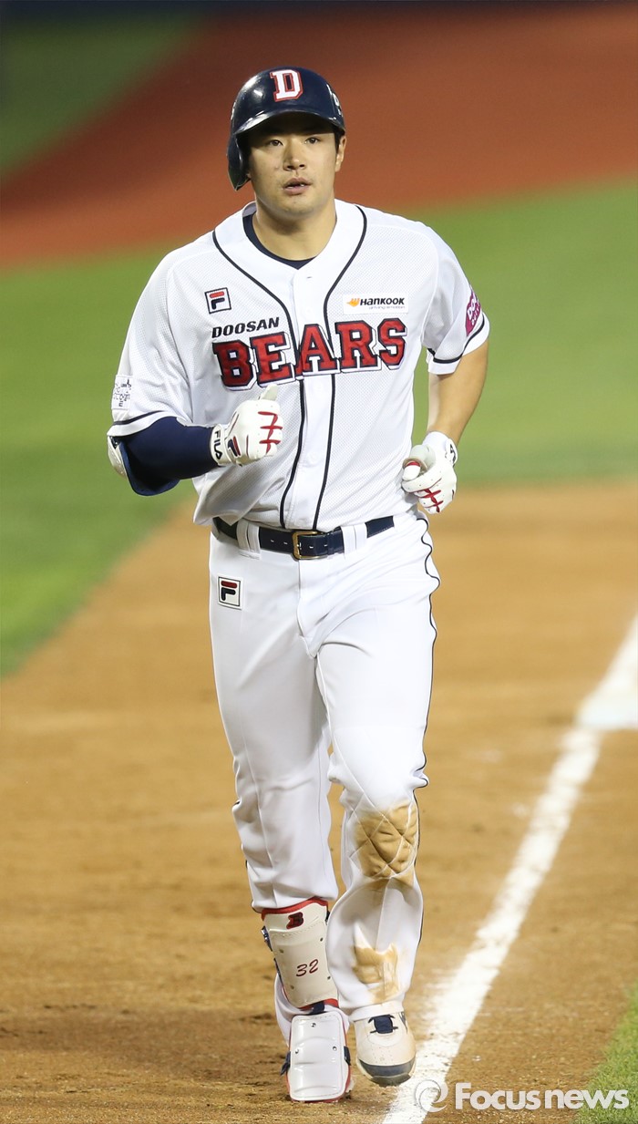 (서울=포커스뉴스) 17일 서울 잠실구장에서 열린 2016프로야구 KIA-두산 경기 4회말 2사후 두산 김재환이 KIA 지크의 초구를 때려 우월 홈런을 치고 3루를 돌아 홈인하고 있다.