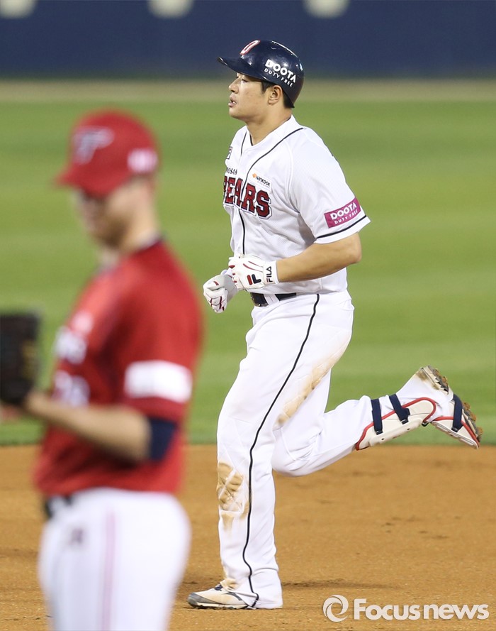 (서울=포커스뉴스) 17일 서울 잠실구장에서 열린 2016프로야구 KIA-두산 경기 4회말 2사후 두산 김재환이 KIA 지크의 초구를 때려 우월 홈런을 치고 그라운드를 돌고 있다.