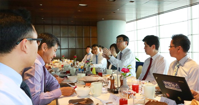 (서울=포커스뉴스) 이기권 고용노동부 장관이 17일 베트남 하노이 롯데호텔에서 현지에 진출한 우리 기업 임원들과 간담회를 갖고, 애로사항을 청취하며 격려하고 있다. <사진제공=고용노동부>
