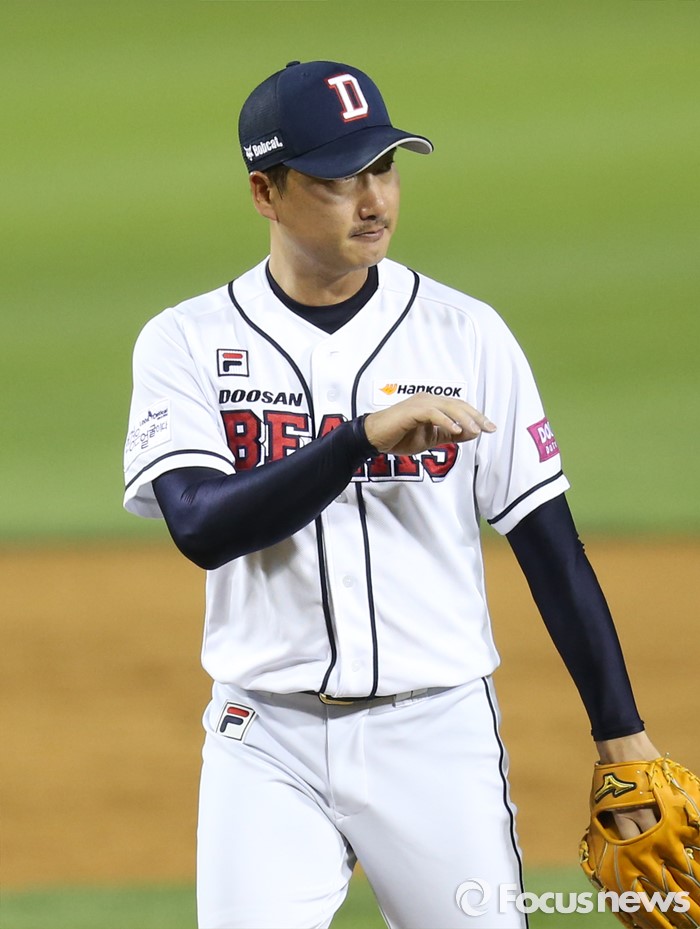 (서울=포커스뉴스) 17일 서울 잠실구장에서 열린 2016프로야구 KIA-두산 경기에서 8회초 두산 정재훈이 투구에 맞은 KIA 나지완에게 미안함을 표하고 있다.