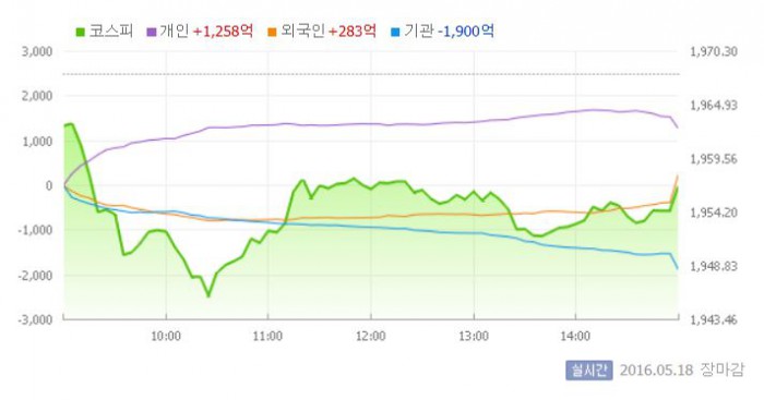 이날 코스피는 전일대비 0.27% 하락한 1962.78로 장을 시작했다. 이후 지수는 외국인과 기관의 동반 매도세에 1940선까지 후퇴했다.