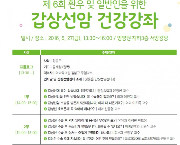 외과 이초록 교수는 ‘수술 후 완치 확인’에 대해, 내과 신동엽 교수는 ‘갑상선 호르몬제의 필요성’에 대해 강의한다.
