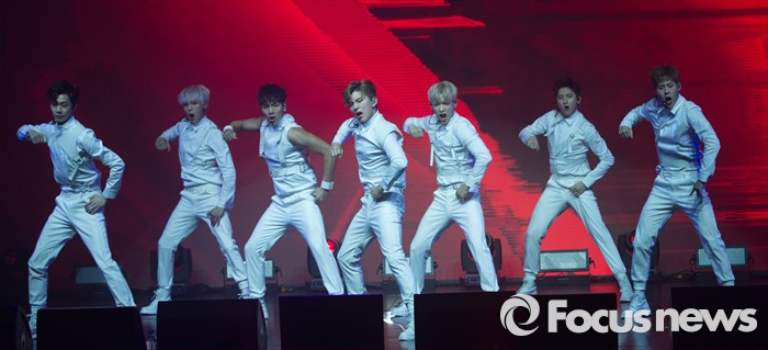(서울=포커스뉴스) 18일 오후 서울 광진구 예스24 라이브홀에서 열린 아이돌그룹 몬스타엑스의 세번째 미니앨범 'THE CLEAN PART. 1 LOST' 발표 쇼케이스에 참석한 멤버들이 신곡 '걸어l'의 무대를 선보이고 있다.