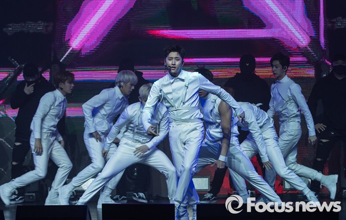 (서울=포커스뉴스) 18일 오후 서울 광진구 예스24 라이브홀에서 열린 아이돌그룹 몬스타엑스의 세번째 미니앨범 'THE CLEAN PART. 1 LOST' 발표 쇼케이스에 참석한 멤버들이 신곡 '걸어l'의 무대를 선보이고 있다.