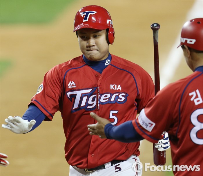 (서울=포커스뉴스) 18일 서울 잠실구장에서 열린 2016프로야구 KIA-두산 경기 5회초 KIA 황대인이 김주형에 이어 백투백으로 좌월 홈런을 치고 김창희 코치의 환영을 받으며 홈인하고 있다.