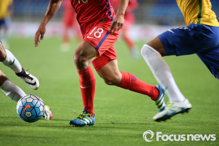 (수원=포커스뉴스) 18일 오후 경기도 수원시 수원월드컵경기장에서 열린 2016 수원 JS컵 U-19 국제청소년축구대회 대한민국과 브라질의 경기에서 한찬희가 드리블을 하고 있다.