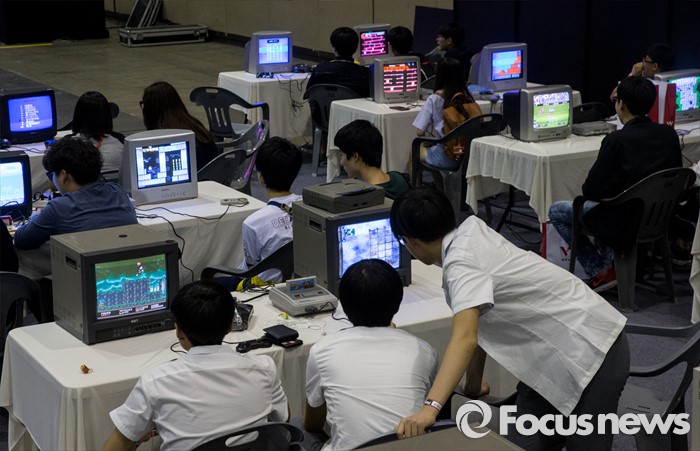 (고양=포커스뉴스) 19일 오후 경기 고양시 킨텍스 제1전시관에서 열린 2016 플레이엑스포를 찾은 관람객들이 고전게임을 즐기고 있다.