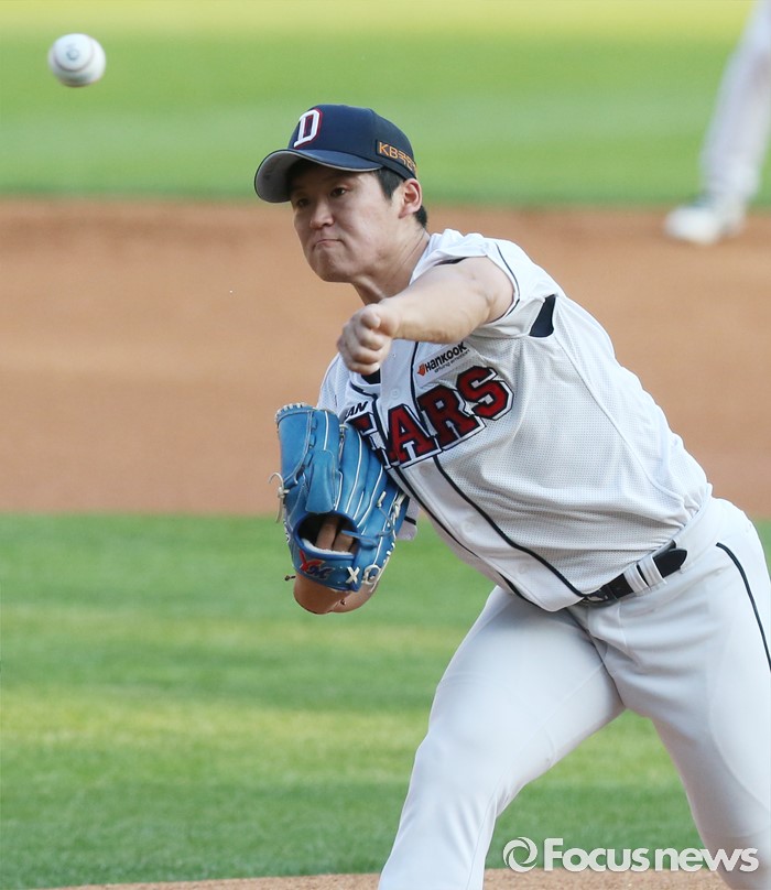 (서울=포커스뉴스) 19일 서울 잠실구장에서 열린 2016프로야구 KIA-두산 경기에서 1회초 두산 선발투수 진야곱이 투구하고 있다.