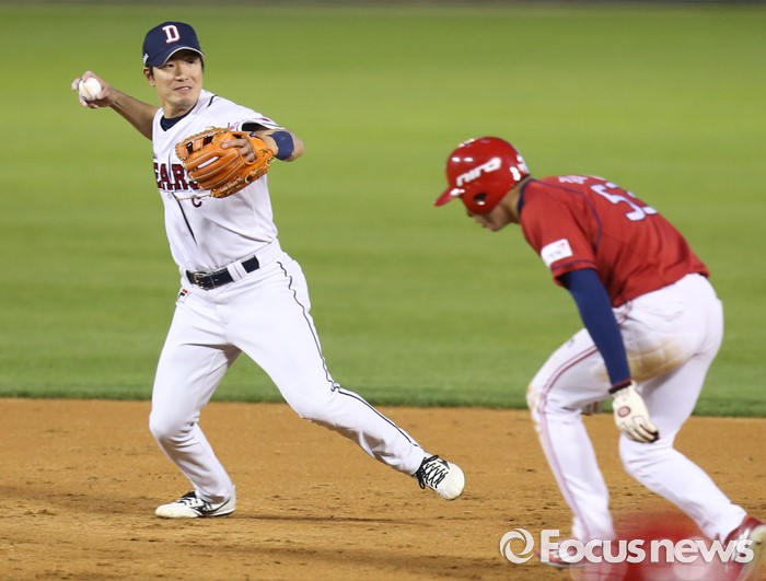 (서울=포커스뉴스) 19일 서울 잠실구장에서 열린 2016프로야구 KIA-두산 경기 4회초 1사 1루에서 KIA 오준혁의 2루 땅볼떄 두산 유격수 김재호가 1루주자 김호령을 포스아웃시키고 1루로 송구해 더블플레이를 성공하고 있다.
