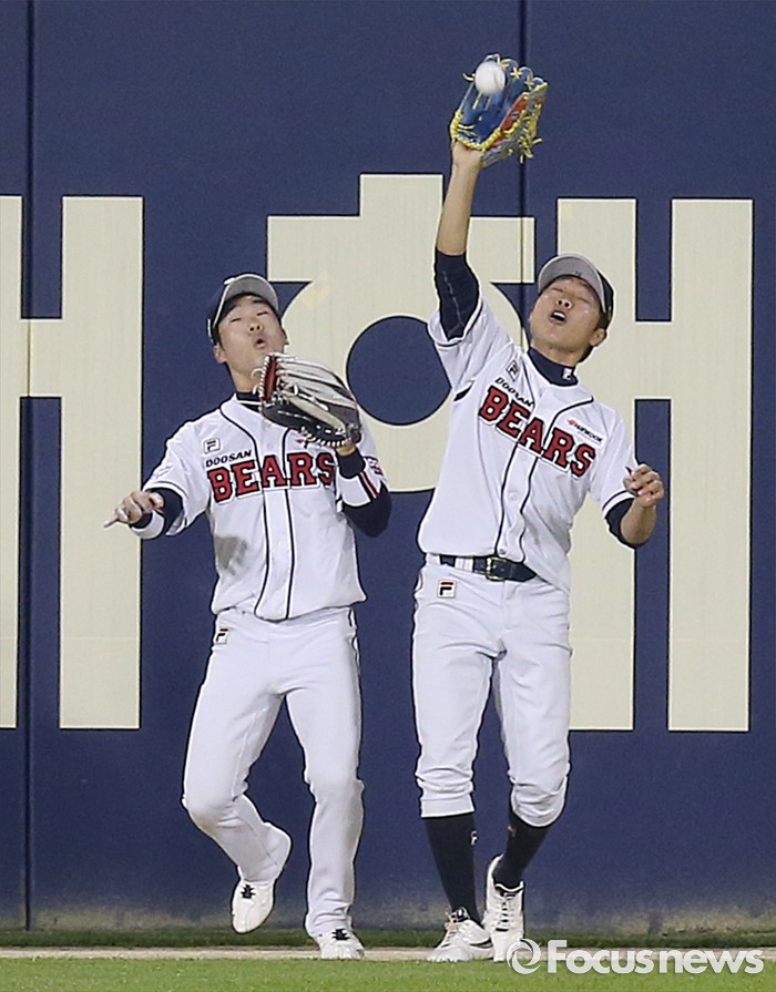 (서울=포커스뉴스) 19일 서울 잠실구장에서 열린 2016프로야구 KIA-두산 경기 9회초 2사후 두산 중견수 정수빈이 KIA 김주형의 뜬공 타구를 잡고 있다. 왼쪽은 좌익수 조수행.