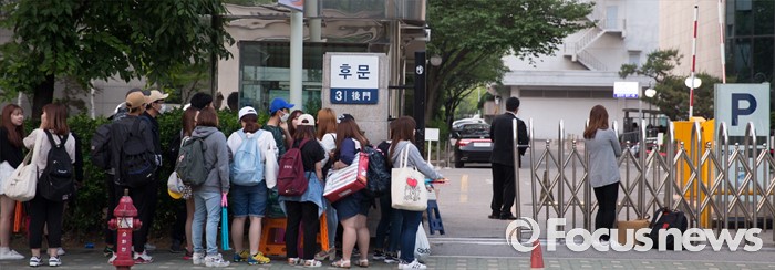 (서울=포커스뉴스) 20일 오전 서울 영등포구 KBS에서 생방송 뮤직뱅크 리허설에 참여하는 가수들을 촬영하기 위해 팬들(왼쪽)과 취재진이 대기하고 있다.