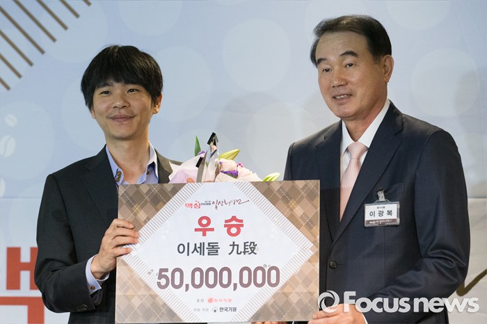 (서울=포커스뉴스) 이세돌(왼쪽) 9단과 이광복 동서식품 대표가 20일 오전 서울 종로구 플라자호텔에서 열린 한국기원 맥심커피배 시상식에 참석해 포즈를 취하고 있다.