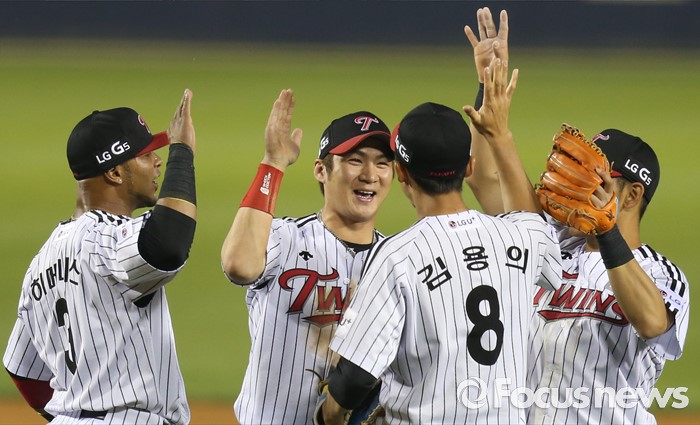(서울=포커스뉴스) 20일 서울 잠실구장에서 열린 2016 프로야구 넥센-LG 경기에서 역전승한 LG 내야수들이 마운드에 모여 하이파이브하며 승리의 기쁨을 나누고 있다.
