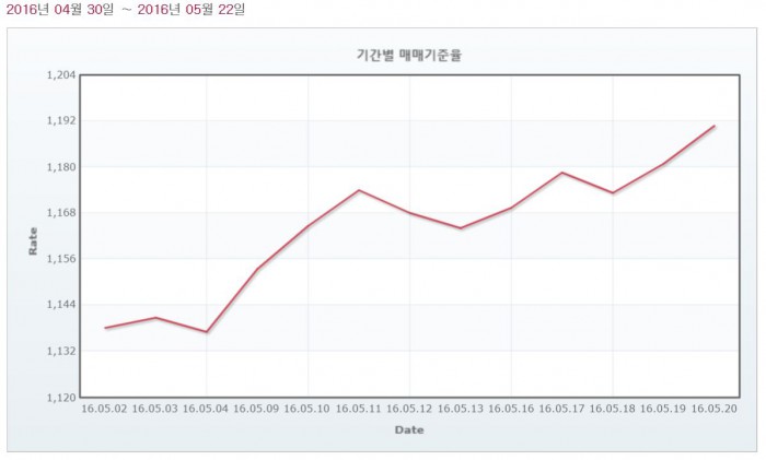 한편, 오는 27일에 미국 1분기 국내총생산(GDP)의 연율 잠정치가 발표된다. 시장 예상치는 0.8% 증가다.지난 1주간 원·달러 매매기준율.<자료제공=서울외국환중개>(서울=포커스뉴스) 미국 연방준비제도의 4월 공개연방시장위원회(FOMC)의사록이 18일(현지시각) 공개됐다. 6월 금리 인상 가능성이 높아지면서 원·달러 환율은 크게 상승하고 있다. 이는 작년 미국 금리 인상설이 불거졌을 때와 비슷한 흐름이다. 2016.05.19 이희정 기자