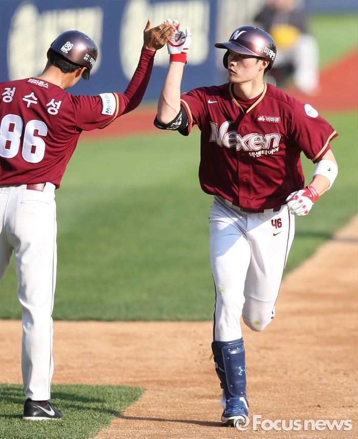 (서울=포커스뉴스) 22일 서울 잠실구장에서 열린 2016 프로야구 넥센-LG 경기 3회초 1사후 넥센 임병욱이 우월 솔로 홈런을 치고 3루를 돌며 정수성 코치와 하이파이브하고 있다.