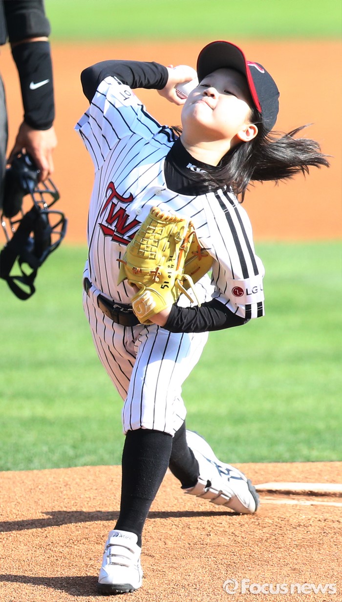 (서울=포커스뉴스) 22일 서울 잠실구장에서 열린 2016 프로야구 넥센-LG 경기에서 여자 야구선수인 이유진 어린이가 시구하고 있다.