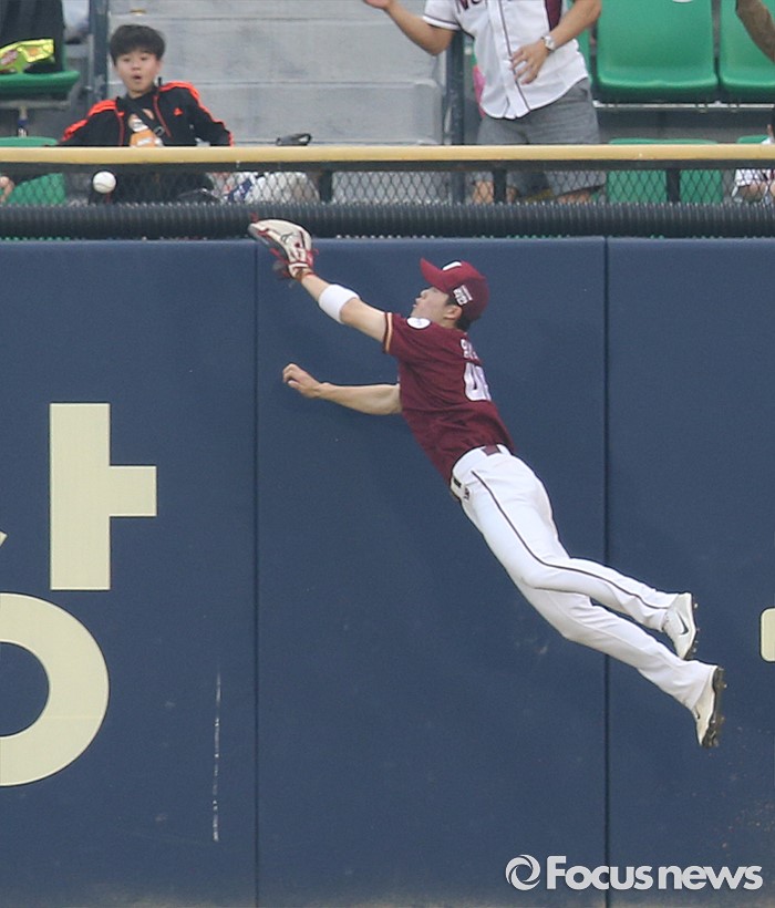 (서울=포커스뉴스) 22일 서울 잠실구장에서 열린 2016 프로야구 넥센-LG 경기 7회말 1사 1,2루에서 LG 박용택의 좌중간 2루타때 넥센 중견수 임병욱이 펜스 앞에서 타구를 잡으려 뛰어 오르고 있다.