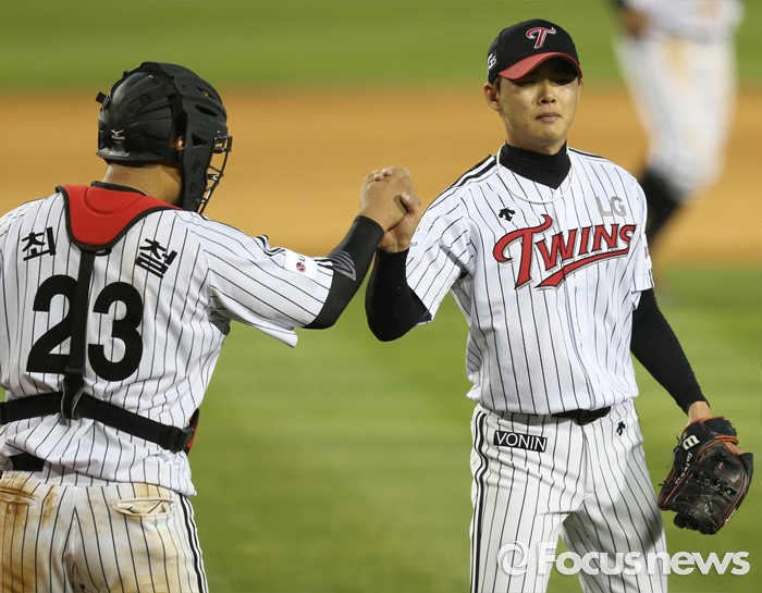 (서울=포커스뉴스) 22일 서울 잠실구장에서 열린 2016 프로야구 넥센-LG 경기에서 승리를 지킨 LG 마무리 투수 임정우와 포수 최경철이 하이파이브하고 있다.