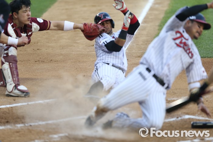 (서울=포커스뉴스) 22일 서울 잠실구장에서 열린 2016 프로야구 넥센-LG 경기 7회말 1사 1,2루에서 LG 박용택의 좌중간 2루타때 2루주자 최경철에 이어 1루주자 히메네스가 홈으로 뛰어들다 넥센 포수 박동원에게 태그아웃되고 있다.