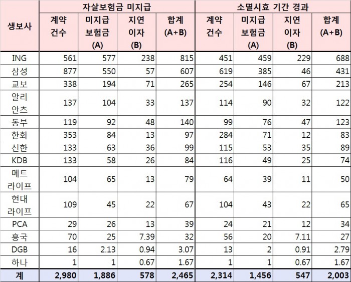 올해 2월26일 기준으로 미지급된 자살보험금은 2485억원, 2980건이며, 이중 81%인 2314건 (2003억원)가 시효가 지난 상태다. 자살보험금 미지급 건수는 삼성생명(877건) ING생명(561건) 한화생명(353건) 교보생명(338건) 알리안츠생명(137건) 신한·KDB생명(각 133건) 동부생명(119건)현대라이프(109건) 메트라이프(104건) 등의 순이다.<자료제공=금융감독원>