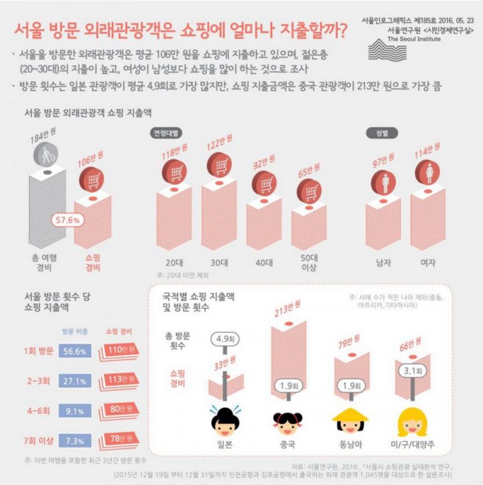 23일 서울연구원 서울인포그래픽스 '서울 방문 외래관광객은 쇼핑에 얼마를 지출할까'에 따르면 서울을 방문하는 외국인관광객의 평균 여행 경비는 184만원이며 이 중 57.6%에 해당하는 106만원을 쇼핑 경비로 쓰고 있다.