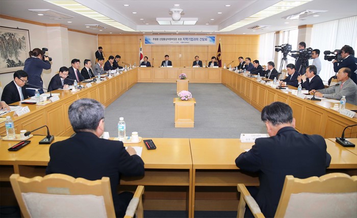 이날 간담회에는 오규택 울산시 경제부시장, 전영도 울산상의 회장, 김환구 현대중공업 사장, 심환기 금강철강 대표, 송재호 경동도시가스 회장, 임봉석 삼성SDI 상무, 김창룡 울산TP 원장, 이필희 여성경제인협회 울산지회장을 비롯한 울산지역 산학연관 관계자 30여명이 참석했다. <사진제공=산업통상자원부>