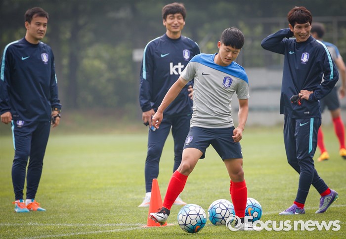 (파주=포커스뉴스) 이승우(18, 바르셀로나 후베닐A)가 25일 오후 경기도 파주 NFC에서 잉글랜드 U18(18세 이하) 대표팀과의 친선전을 앞두고 축구대표팀 선수들과 소집 훈련에 임하고 있다.