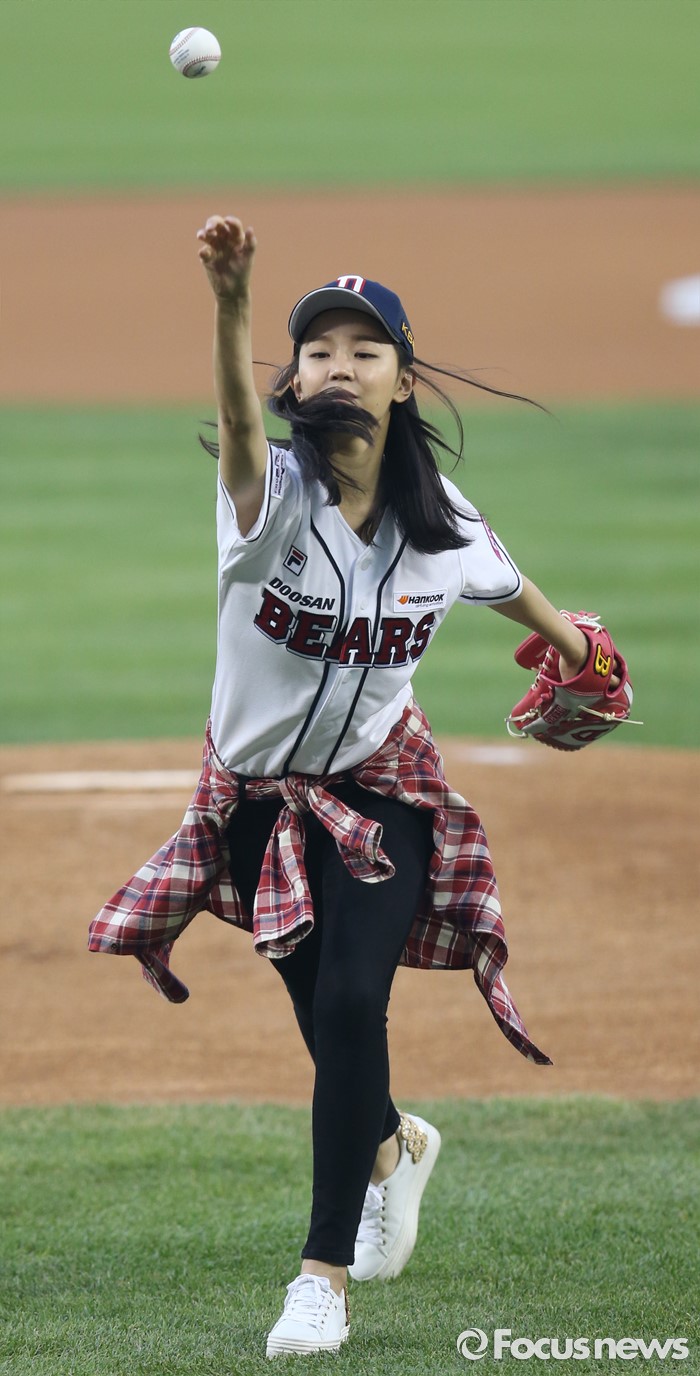 (서울=포커스뉴스) 25일 서울 잠실구장에서 열린 2016 프로야구 kt-두산 경기에 앞서 배우 신혜선이 시구하고 있다.