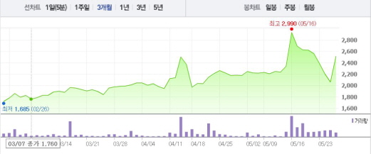 씨씨에스는 26일 오전 9시22분 현재 전일 대비 21.36%(440원) 상승한 2500원에 거래 중이다. 같은 시각 한창은 전일 대비 22.22%(1200원) 상승한 6600원에 거래되고 있다.