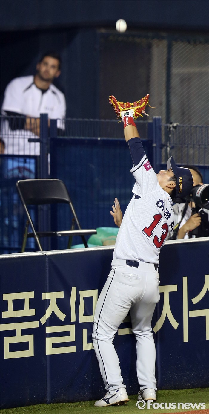 (서울=포커스뉴스) 26일 서울 잠실구장에서 열린 2016프로야구 kt-두산 경기 7회초 1사 2루에서 두산 3루수 허경민이 kt 김상현의 파울 타구를 kt 덕아웃 앞애서 잡고 있다.
