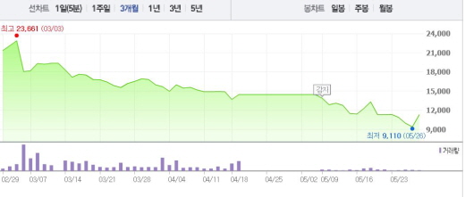 산업은행은 26일 협상이 타결됐다는 일부 보도에 대해 “협상 상황이 진전되고는 있지만, 아직 용선료 조정율 등 합의에 이른 상황은 아니다”라고 말했다.주가흐름<사진출처=네이버 캡쳐>