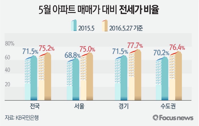 (서울=포커스뉴스) 27일 KB국민은행에 따르면 5월 27일 기준 서울 아파트 매매가격 대비 전세가 비율(전세가율)이 사상 처음으로 75%대에 도달했다.